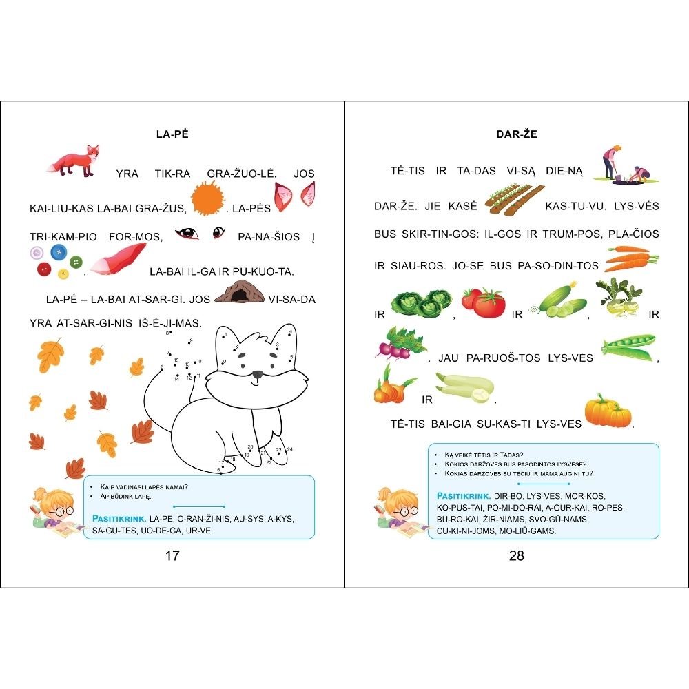 Šioje knygelėje rasite tekstų su paveikslėliais. Skaitydamas vaikas turi pakeisti paveikslėlius žodžiais ir išlaikyti tekstų prasmę. Teksto pabaigoje pateikiami teksto suvokimo klausimai – tai gera mankšta vaiko atminčiai! Paprastai vaikams daug lengviau skaityti tekstus su paveikslėliais, o ne su žodžiais, nes paveikslėlis atlieka tam tikrą suflerio funkciją. Vaikas gali pasakyti žodžio skaičių, linksnį ir kt.