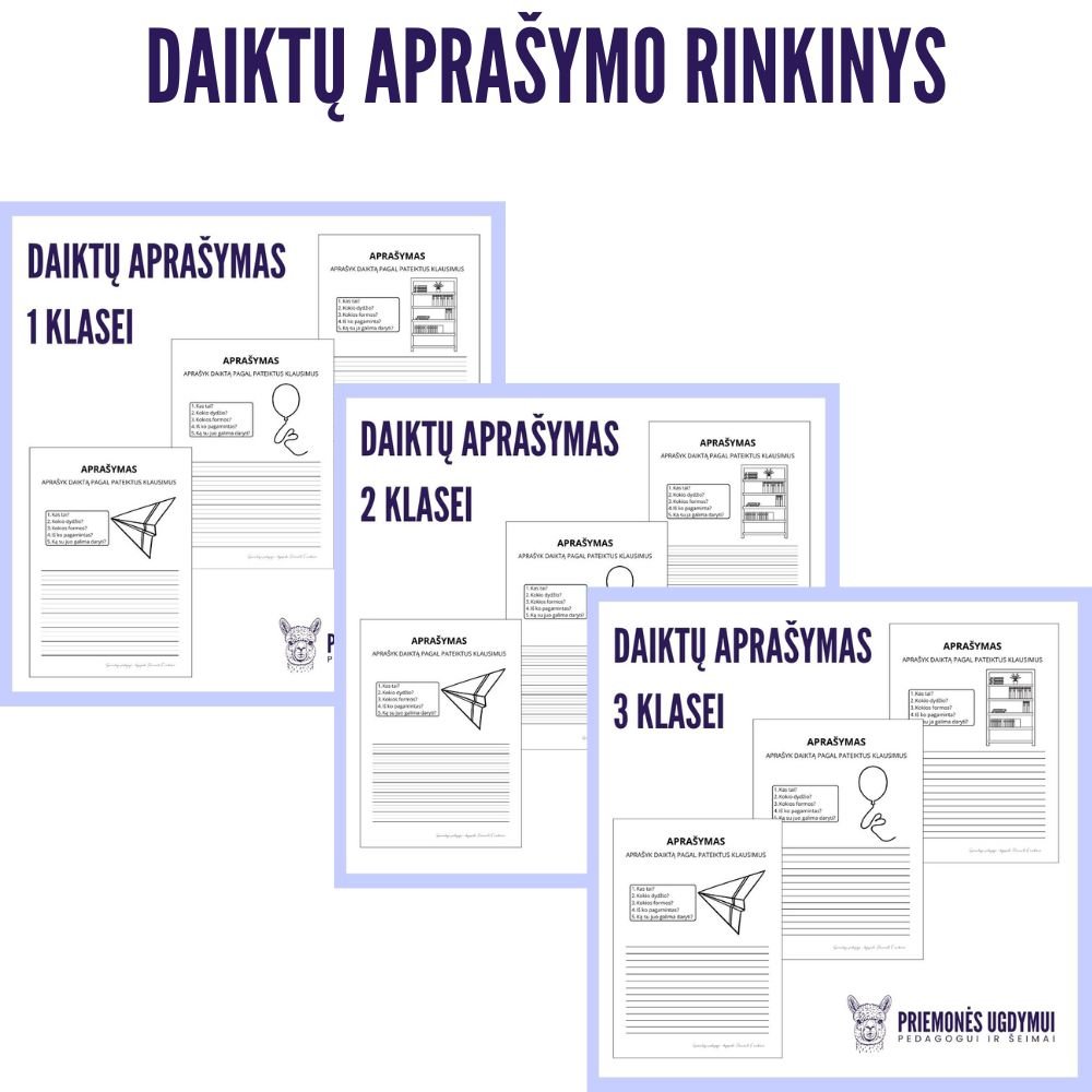 80 užduočių lapų mokiniams nuo 3 klasės. Priemonė skirta mokytis apibūdinti daiktą raštu. Tokio tipo užduotys ugdo kalbos gramatinį taisyklingumą, rišliąją kalbą, plečia žodyną, tobulina rašymo gebėjimus.