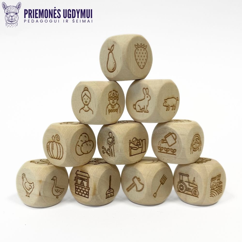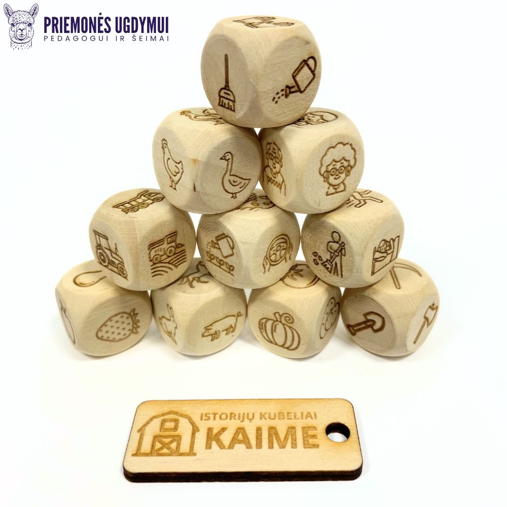 Tai 10 kubelių rinkinys, kuriame rasite 60 paveikslėlių pasakojimo kūrimui kaimo tema.