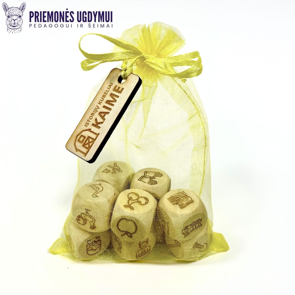Kubeliai pagaminti iš natūralaus medžio, graviruoti ir malonūs liesti, 2x2x2 cm dydžio.