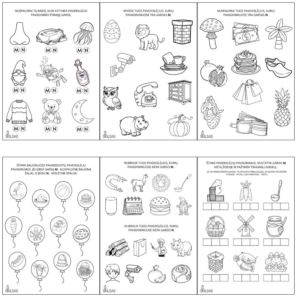 - garsų atpažinimas: užduotys, kuriose reikia nuspalvinti raidę, atitinkančią pirmąjį paveikslėlio garsą;