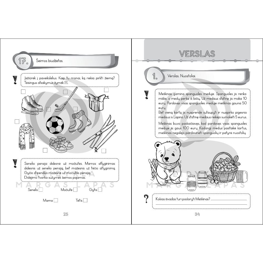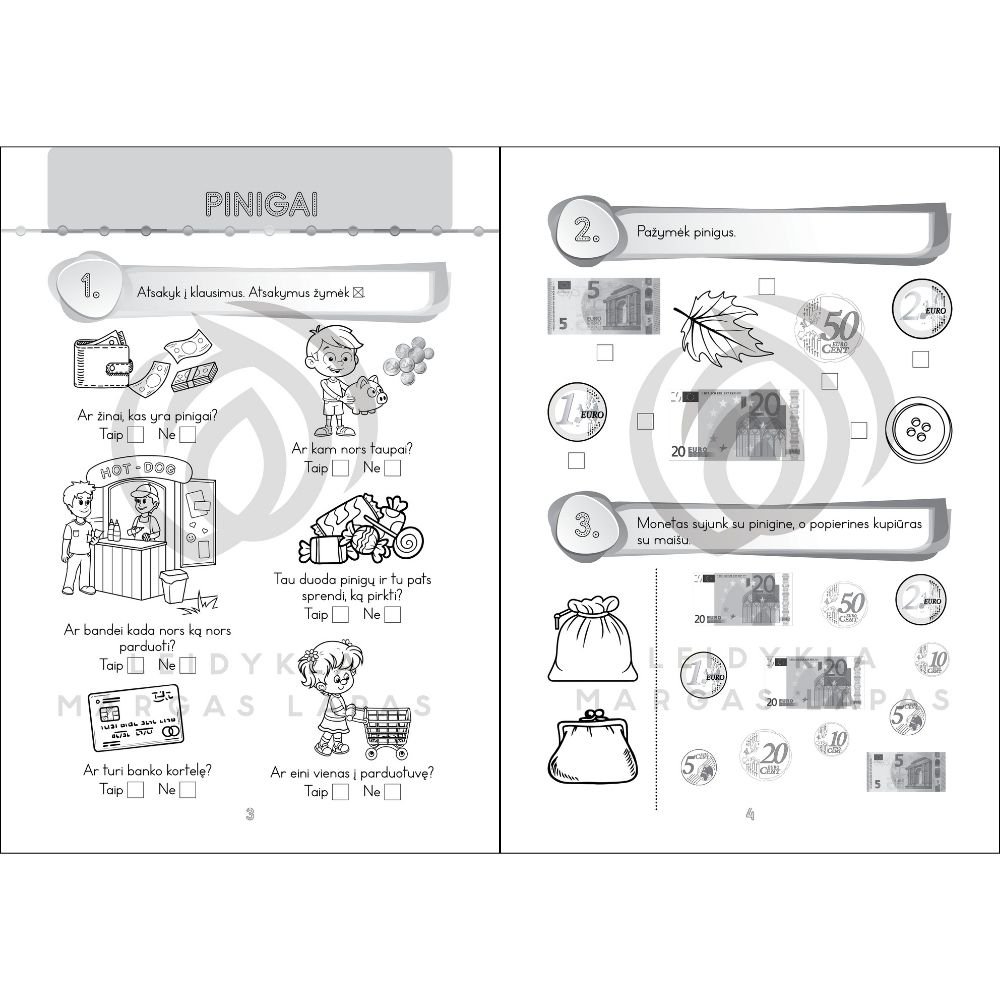 Kiekvieno žmogaus gyvenimas neatsiejamas nuo pinigų. Su pinigais susiduriame kasdien. Eidami į mokyklą vaikai gauna kišenpinigių, jau nuo to laiko reikia pradėti juos mokyti elgtis su pinigais.Finansinis raštingumas – tai žinios ir įgūdžiai, padedantys išmintingai valdyti savo pinigus. Leidinys skirtas 2–3 klasių mokiniams kaip papildoma mokomoji priemonė siekiant mokyti finansinio raštingumo pagrindų. Vaikai susipažins su „biudžeto“, „mainų“, „pinigų“, „pajamų“, „išlaidų“ ir kitais pagrindiniais finansiniais terminais. Specialiai sukurtos užduotys skirtos pažintinei veiklai, intelektui, mąstymui, vaizduotei lavinti. Atlikdami užduotis vaikai susipažins su galimomis būtinosiomis išlaidomis, sužinos, kas yra šeimos biudžetas, draudimas, išmoks apskaičiuoti verslo nešamą pelną ir patirtus nuostolius. Leidinį sudaro 4 skyriai: Pinigai; Šeimos biudžetas; Kišenpinigiai; Verslas.