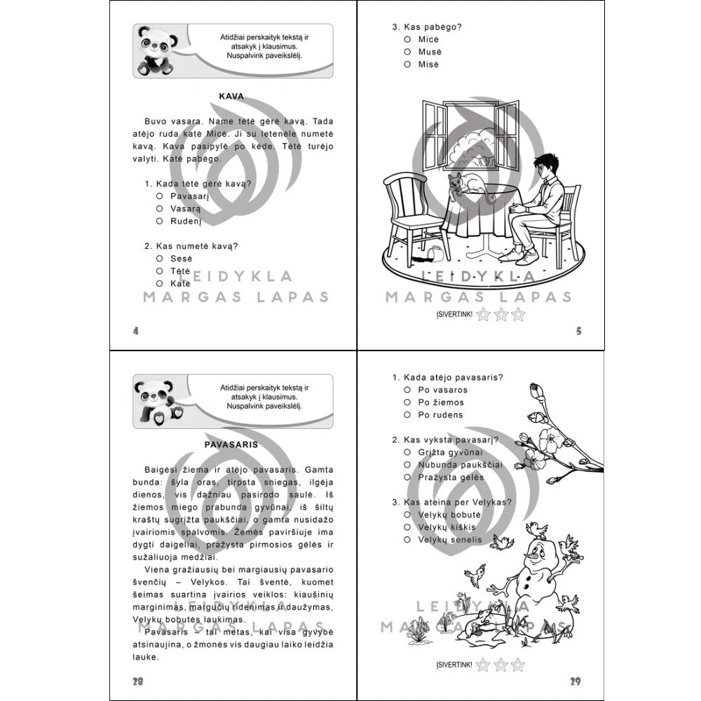 Leidinys skirtas priešmokyklinio ir mokyklinio amžiaus vaikams, norintiems išmokti skaityti ir suprasti tekstą. Užduotys tiks ir specialiųjų ugdymosi poreikių turintiems moksleiviams, kurie patiria skaitymo ir teksto suvokimo sunkumų. Leidiniu rekomenduojame naudotis priešmokyklinio ir mokyklinio ugdymo pedagogams, specialiesiems pedagogams, logopedams ir tėvams, prisidedantiems prie vaikų ugdymo namuose. Užduotys skatins vaikus taisyklingai perskaityti sakinius, juos jungti į tekstą ir atsakyti į klausimus. Spalvinimo užduotys padės vaikams pagerinti rankos judesių tikslumą ir ugdys kantrybę. Leidinys sukurtas taip, kad ugdytų kritinį mąstymą, kūrybiškumą, tobulintų teksto suvokimo gebėjimus ir turtintų vaiko žodyną.