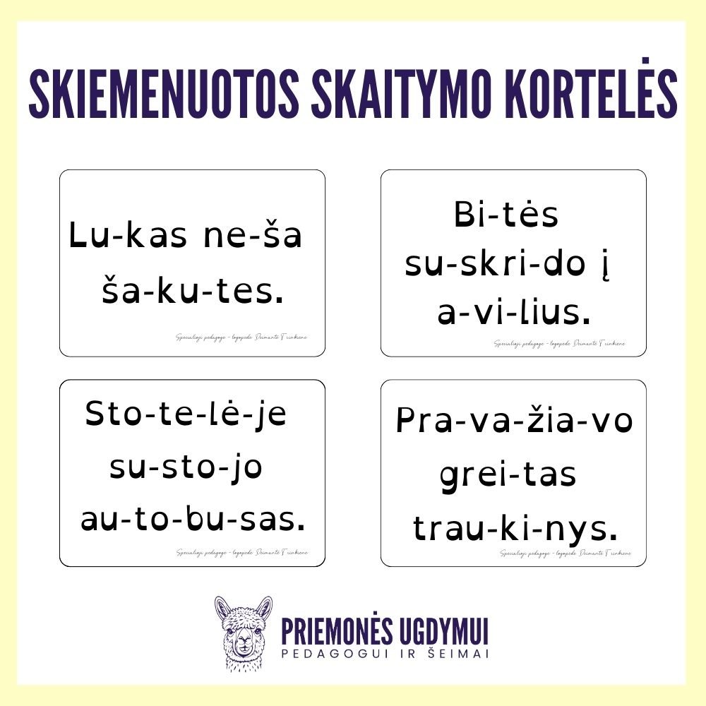 320 skiemenuotų kortelių (viename lape 8 kortelės). Parengtos OpenDyslexic šriftu (skirtu disleksiją turintiems asmenims). Vienoje kortelėje – vienas sakinys (nuo 2 iki 5 žodžių). Kortelės nespalvotos.