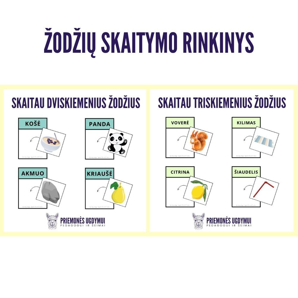 80 kortelių su dviskiemeniais žodžiais ir 80 paveikslėlių. Skirta mokytis skaityti dviskiemenius žodžius (įvairaus sudėtingumo) ir juos suprasti, surasti tinkamą paveikslėlį ir užklijuoti ar uždėti ant kortelės su parašytu žodžiu.